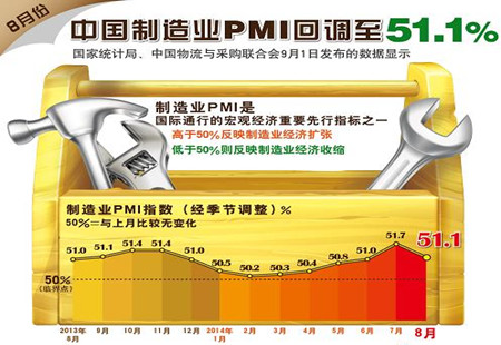 8月PMI數(shù)據(jù)走勢回落:鋼鐵業(yè)等過剩產(chǎn)業(yè)拖累中國物流與采購聯(lián)合會、國家統(tǒng)計局服務(wù)業(yè)調(diào)查中心發(fā)布的2014年8月份中國制造業(yè)采購經(jīng)理指數(shù)(PMI)為51.1%,比上月回落0.6個百分點。該指數(shù)雖然有所回落,但仍保持在51%以上。綜合來看,當(dāng)前經(jīng)濟運行基本平穩(wěn)態(tài)勢沒有... [詳細(xì)]
