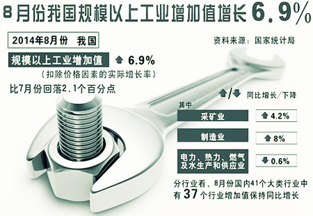 8月份規(guī)模以上工業(yè)增加值增長6.9%2014年8月份,規(guī)模以上工業(yè)增加值同比實際增長6.9%(以下增加值增速均為扣除價格因素的實際增長率),比7月份回落2.1個百分點。從環(huán)比看,8月份比上月增長0.20%。1-8月份,規(guī)模以上工業(yè)增加值同比增長8.5%。 [詳細(xì)]