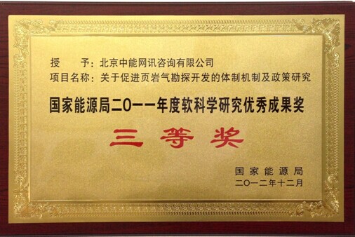 國家能源局授予:北京中能網訊咨詢有限公司(中國能源網)關于促進頁巖氣勘探開發的體制機制及政策研究“國家能源局2011年度軟科學研究優秀成果獎”