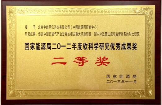 國家能源局授予北京中能網訊咨詢有限公司(中國能源網研究中心)促進中國頁巖氣發展相關重大問題研究——國內外政策法規與監管體系對比研究“國家能源局2012年度軟科學研究優秀成果獎”
