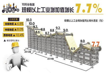 工業增加值增速持續走低 宏觀經濟政策期待加碼國家統計局13日公布的數據顯示,2014年10月份,我國規模以上工業增加值增速為7.7%,比9月份環比下跌0.3%,工業增長依舊低迷;1月-10月城鎮固定資產投資增速15.9%,延續了今年以來不斷下跌的趨勢;而10月份社... [詳細]