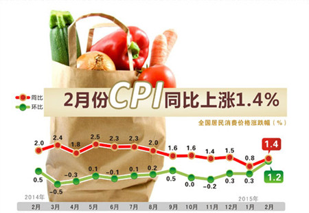 2月份CPI同比增長1.4%3月10日訊,2015年2月份,全國居民消費價格總水平同比上漲1.4%。其中,城市上漲1.5%,農村上漲1.2%;食品價格上漲2.4%,非食品價格上漲0.9%;消費品價格上漲1.1%,服務價格上漲2.2%。1-2月平均,... [詳細]