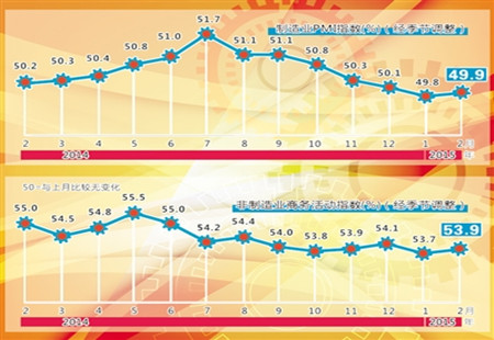 2月份制造業和非制造業PMI小幅回升國家統計局、中國物流與采購聯合會1日發布的數據顯示,2月份我國制造業和非制造業采購經理指數(PMI)分別比上月回升0.1和0.2個百分點,達到49.9%和53.9%。 [詳細]