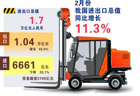 2月份我國進出口總值同比增長11.3%海關總署8日公布數據,2月份我國進出口總值1.7萬億元人民幣,同比增長11.3%。其中,出口1.04萬億元,增長48.9%;進口6661億元,下降20.1%;當月貿易順差3705億元。 [詳細]
