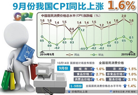 9月CPI同比增長1.6% 重返1時代2015年9月份,全國居民消費價格總水平同比上漲1.6%。其中,城市上漲1.6%,農村上漲1.5%;食品價格上漲2.7%,非食品價格上漲1.0%;消費品價格上漲1.4%,服務價格上漲2.1%。1-9月平均,全國居民消費價... [詳細]