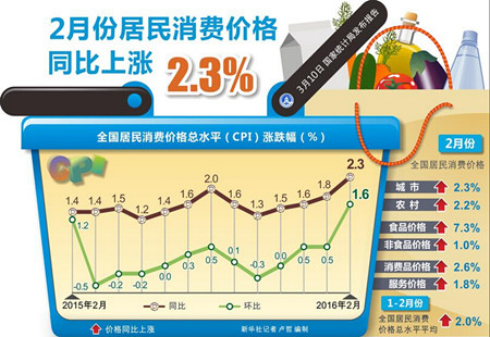 2月份CPI同比漲幅“破2”達2.3%國家統計局10日發布數據,2月份全國居民消費價格總水平(CPI)同比上漲2.3%,漲幅比1月份擴大0.5個百分點。這是時隔一年半后,CPI漲幅首次突破2%。 [詳細]