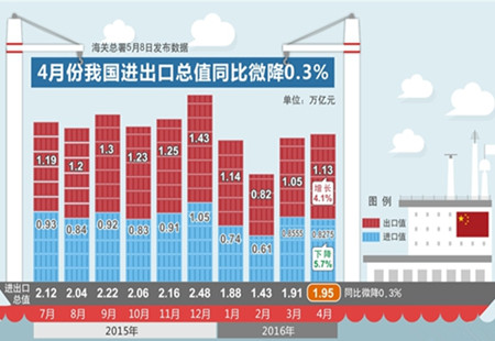 前4月我國進(jìn)出口貿(mào)易降幅大幅收窄 預(yù)計(jì)全年增速扭負(fù)為正近日,海關(guān)信息網(wǎng)發(fā)布了《2016年一季度經(jīng)濟(jì)形勢綜述及我國進(jìn)出口貿(mào)易形勢分析報(bào)告(以下簡稱:春季報(bào)告》)。該報(bào)告對我國2016年第一季度進(jìn)出口貿(mào)易及宏觀經(jīng)濟(jì)運(yùn)行情況進(jìn)行了盤點(diǎn),對進(jìn)出口貿(mào)易結(jié)構(gòu)主要特點(diǎn)進(jìn)行了深入分析。 [詳細(xì)]