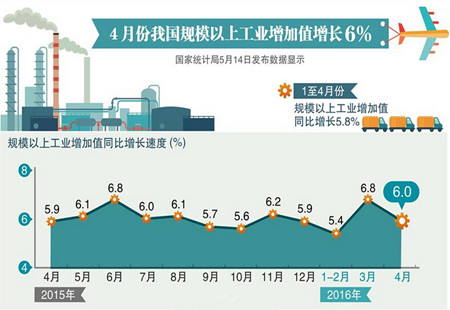 4月工業(yè)生產(chǎn)增速有所回落 結(jié)構(gòu)調(diào)整繼續(xù)取得積極進(jìn)展5月14日,國家統(tǒng)計(jì)局發(fā)布的工業(yè)生產(chǎn)數(shù)據(jù)顯示:4月份全國規(guī)模以上工業(yè)增加值同比實(shí)際增長6%,增速較3月份回落0.8個(gè)百分點(diǎn)。盡管4月份工業(yè)生產(chǎn)增速有所回落,但結(jié)構(gòu)調(diào)整繼續(xù)取得積極進(jìn)展。 [詳細(xì)]