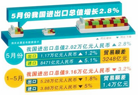 5月份我國進出口總值增長2.8%海關總署發布數據,5月份我國進出口總值2.02萬億元人民幣,比去年同期增長2.8%。1至5月,我國進出口總值9.16萬億元人民幣,同比下降3.2%,降幅較前4個月收窄1.6個百分點。其中,出口5.28萬億元、進口3.88... [詳細]