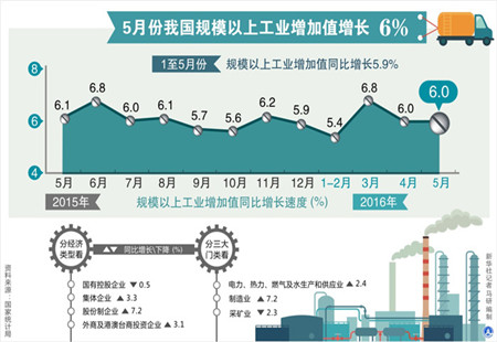 5月規模以上工業增加值增長6.0%2016年5月份,規模以上工業增加值同比實際增長6.0%(以下增加值增速均為扣除價格因素的實際增長率),與4月份持平。從環比看,5月份,規模以上工業增加值比上月增長0.45%。1-5月份,規模以上工業增加值同比增長5.9... [詳細]